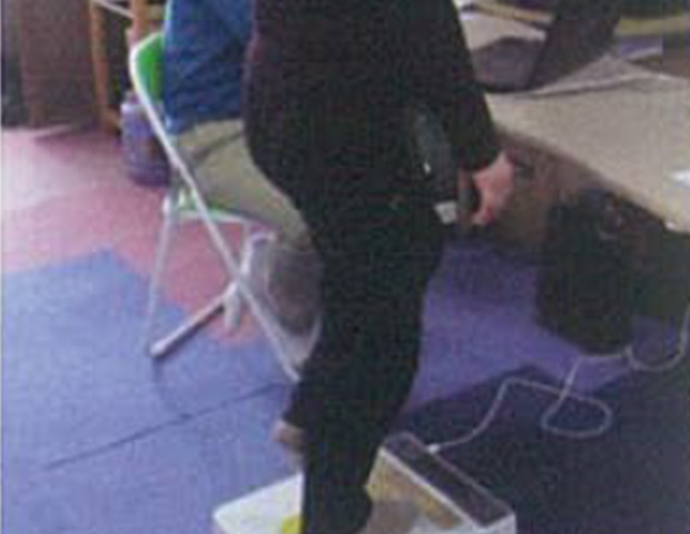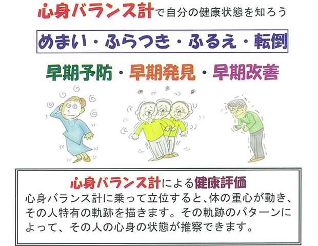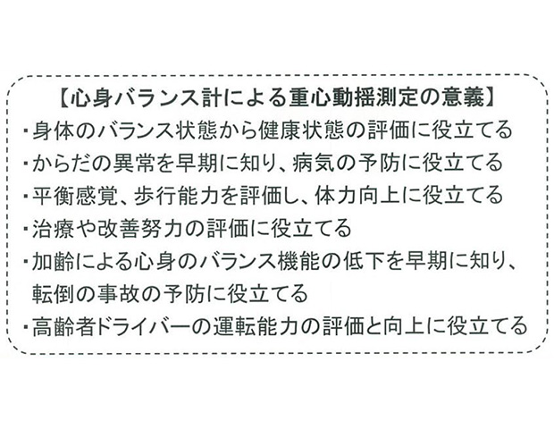 「心身バランス計」を使用して、立位時のバランスを計測します。 この検査により足腰の強さや、立位・歩行時の転倒の危険性などを知ることができます。
